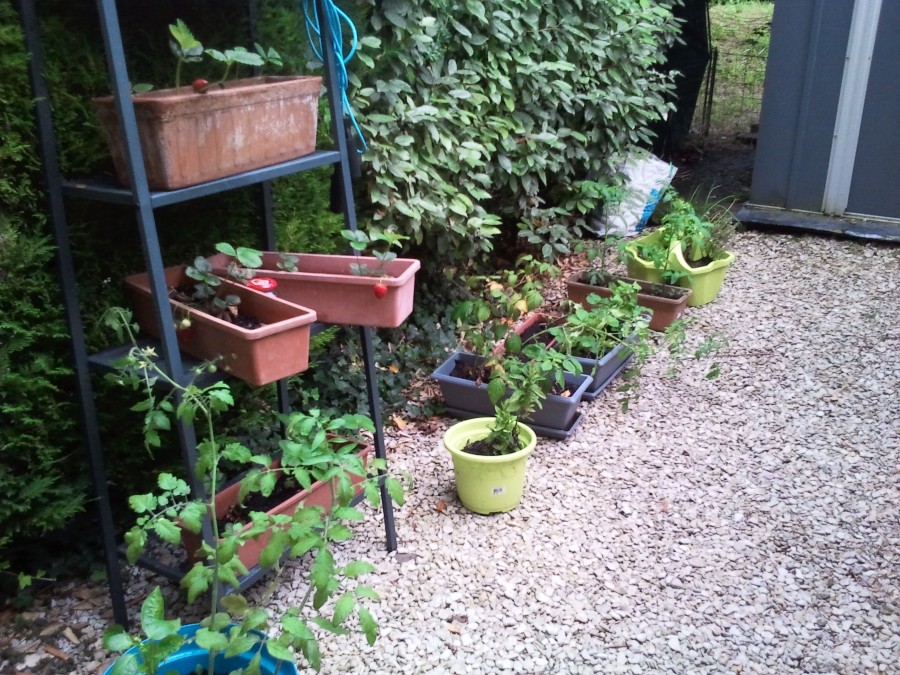- Jardinières perpendiculaires aux framboisiers : fraisiers devant et 2 pieds de tomates derrière (1 de tomates cerises et je crois mon pied de tomates noires de Crimée)