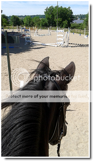 J'avais peur de trop attendre de la jument ou d'être tellement contente de la voir enfin et qu'elle corresponde à tous mes critères et être donc trop "gentille" et tout voir bien. Donc on arrive, on voit la jument, très câline et tactile, elle est jeune 4 ans donc à tendance à essayer de mordre la vilaine ! Je la prépare, je monte dessus. Elle a l'air énergique mais assez à l'écoute. Elle regarde tout partout mais ça va. Elle a une bonne direction. Son trot est très très rebondissant, ça m'a surpris au début haha. Au galop elle est bien, confortable et elle le tient, ça m'a surpris pour une aussi jeune jument, j'arrivais à faire des cercles et à ralentir sans qu'elle ne passe au trot ! D'ailleurs elle part au galop à peut près en équilibre, pas du genre à trotter jusqu'à partir au galop et elle part presque au galop du pas. Par contre niveau déplacements latéraux c'est pas ça mais elle est jeune, elle a le temps d'apprendre ♥. Après la détente le patron me met une petite croix que je franchis deux fois au trot et une fois au galop... Mon dieu, un amour sur les barres ! Elle y va, elle dépote pas, elle charge pas et après l'obstacle elle garde un petit galop gérable, dès le premier saut j'adore ! Et puis le mec me demande ce que je veux. Je lui demande un petit verticale et il me propose un verticale, 5 foulées et un bon oxer de 80-90. J'accepte (j'avais pas vu la taille qu'il allait mettre haha). Bon, je vous avoue j'étais un peu moins seraine car je ne connais pas la jument, le terrain et le coach donc j'oublie un peu que j'ai un bébé sous les fesses et madame me fait un écart tête en bas à cause d'une flaque. J'étais dans un virage et tellement concentré sur les obstacle que je suis passée par dessus bord, l'horreur. Mais bon, je remonte dessus, je suis une professionnelle des chutes haha. Je la fais passer au pas dans la flaque, elle dit rien (ouh la coquine qui test ;P). Je fais une volte et reprends mon galop, un peu trop forte dans les mains mais elle y va, elle saute les deux obstacles sans regarder (sous l'oxer 2 piscines pour enfant jaune). Elle est simple à amener et y va sans soucis. J'y retourne une seconde fois car sur le premier j'étais un peu stressée par la chute et la jument voulait tester encore haha. Deuxième passage largement mieux, je décide de la laisser là-dessus. Mon amie qui a un niveau moins bon que le mien monte dessus pour me donner son ressentit et ainsi je pouvais voir la jument monté. Elle a bien aimé et moi aussi...