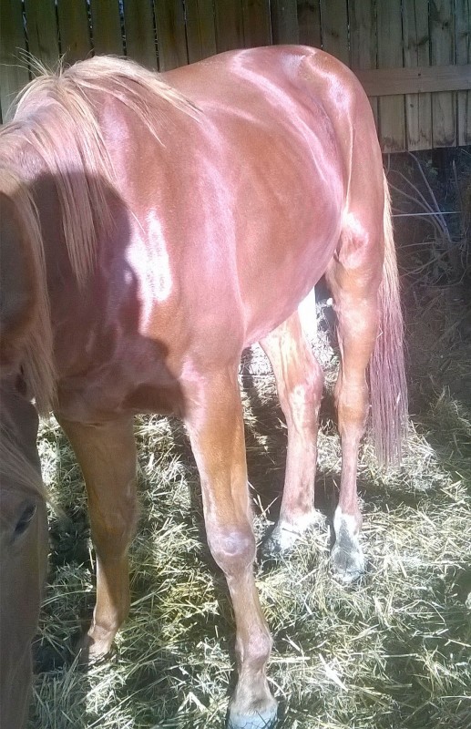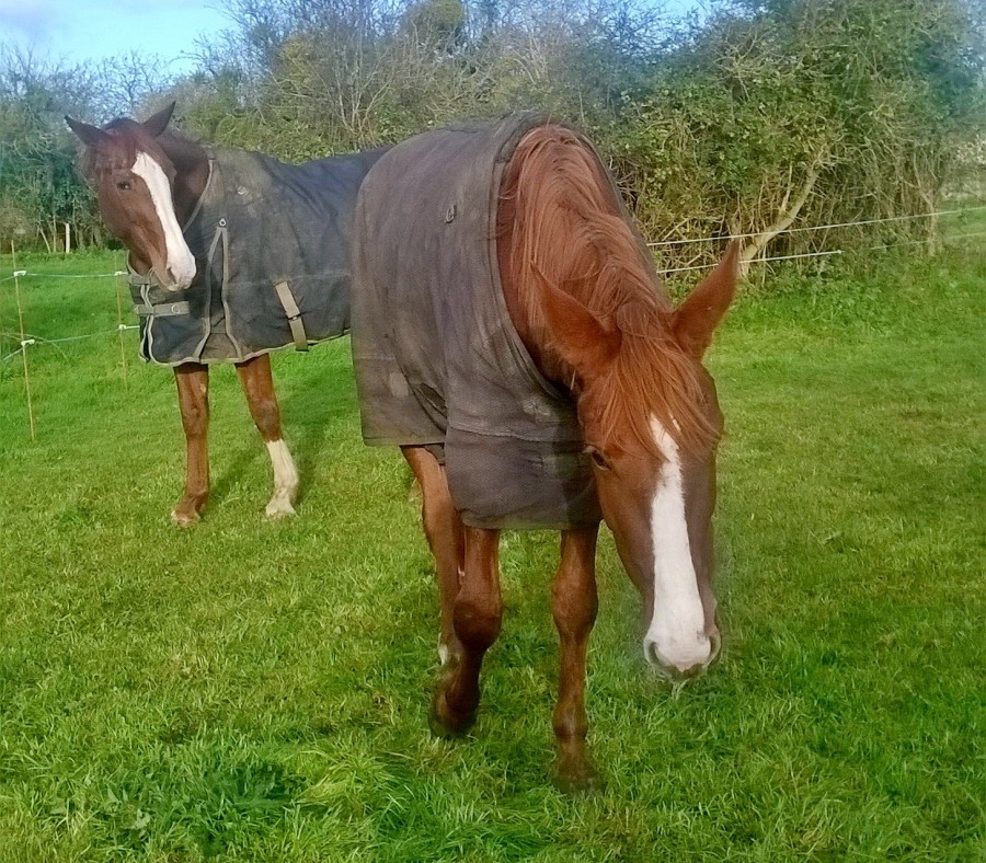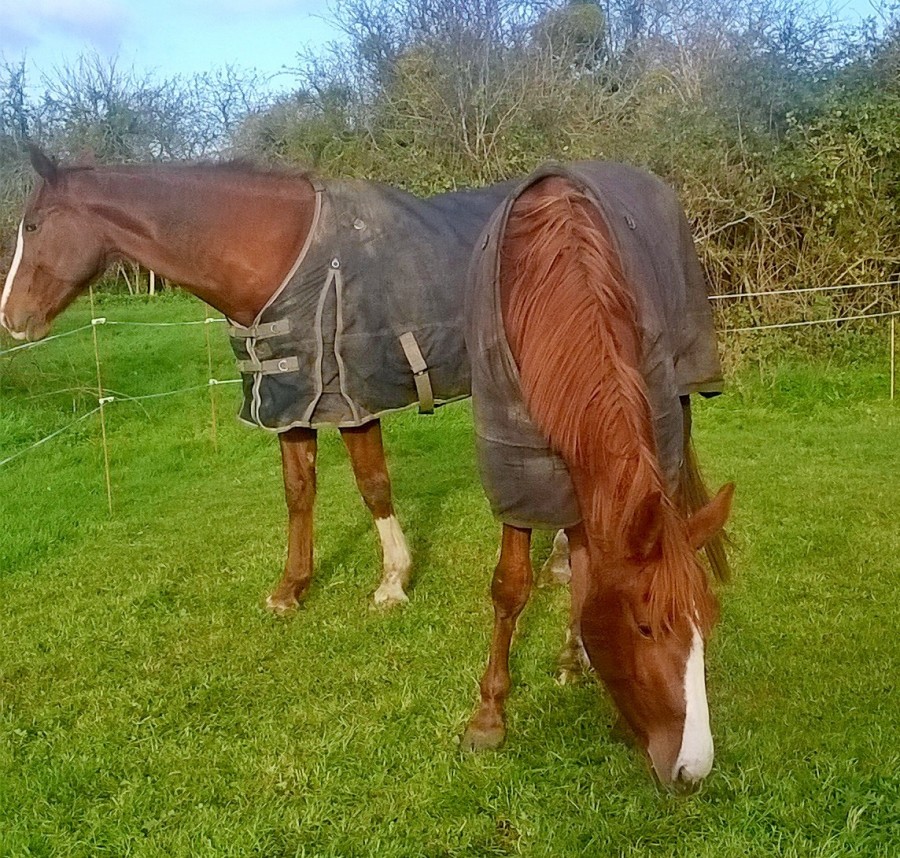 Le problème, c'est que depuis qu'elle est couverte, elle reprends vraiment bien du poids. Avant que je la couvre, les côtes étaient encore bien visibles, depuis qu'elle a sa couverture elle fait beaucoup plus de graisse et n'est pas chaude sous la couverture. Pourtant, sa nourriture n'a pas augmenté, j'ai même baissé un peu la dose et elle est toujours à l'herbe et au foin. Donc je préfère la laisser couverte, qu'elle fasse un maximum de gras avant l'hiver, surtout qu'elle ne transpire pas en dessous :/