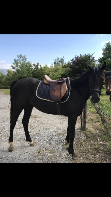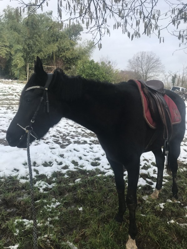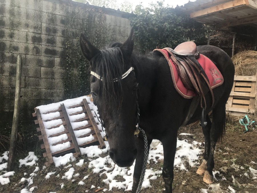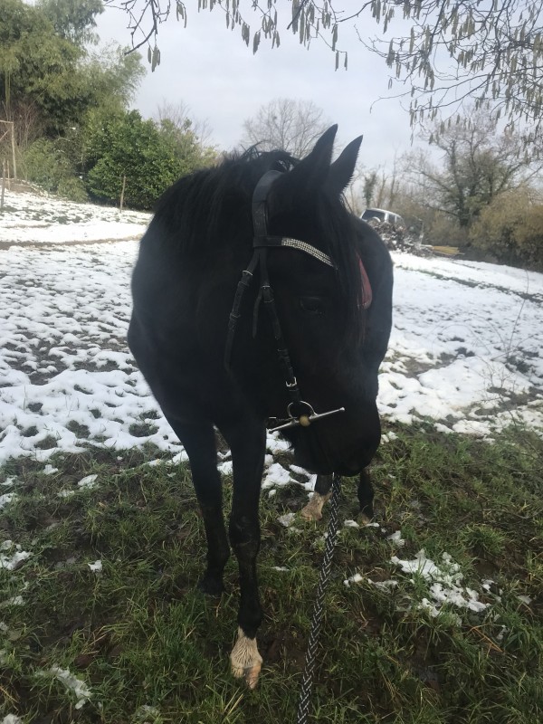 Faites pas attention à l'équipement précaire sur la photo, j'ai nouer une longue rênes autour de l'encolure du poney pour que ma fille se tienne et j'ai préféré lui laisser le licol par dessus le filet, c'est pas très classe mais je joue la carte de la sécurité pour tout le monde
