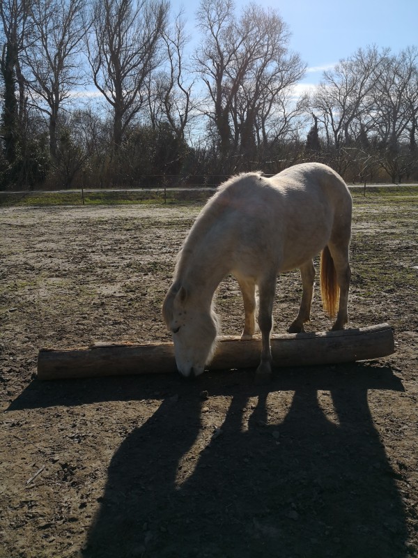 Finalement, pas de sac à patates puisque la demoiselle n'était pas à l'aise, Forever étant très détendu, nous avons pris la décision de sauter une étape, c'est ainsi que ma fille a enjamber le poney, aucune réaction, en marche en main à côté de lui, puis au pas en longe sur le cercle