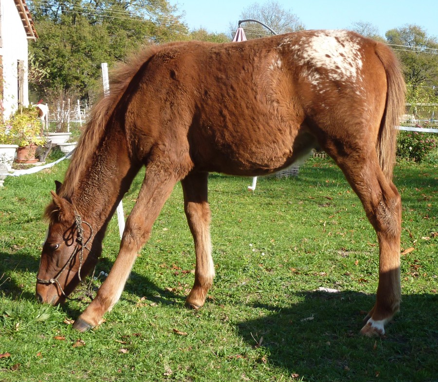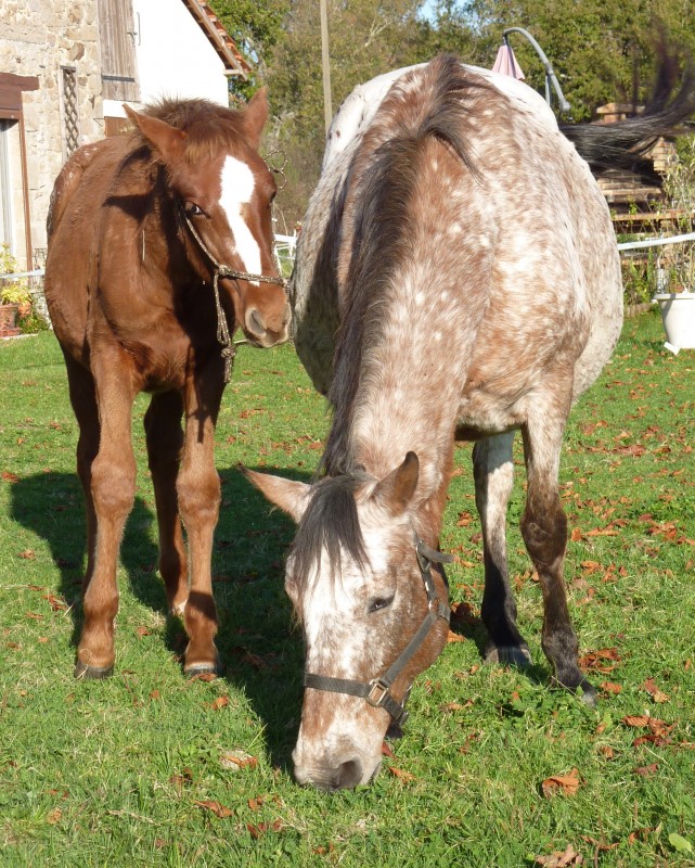 Sinon, niveau apprentissage, il se laisse toucher de partout (je l'ai même désensibilisé au thermomètre), accepte le pansage intégral sans bouger, se fait curer les pieds comme un grand, a déjà vu 3 fois le maréchal, suit à la longe sans problème, même sans sa mère, et n'a peur de pas grand chose... à part des piqûres ! Justement, c'est mon objectif pour début 2016, lors des primo-vaccinations après son sevrage.