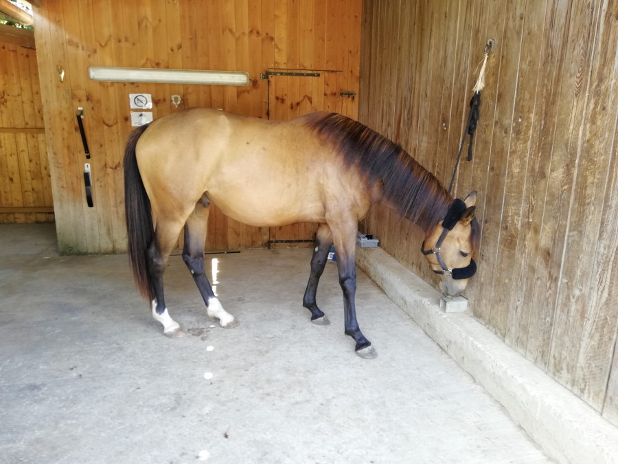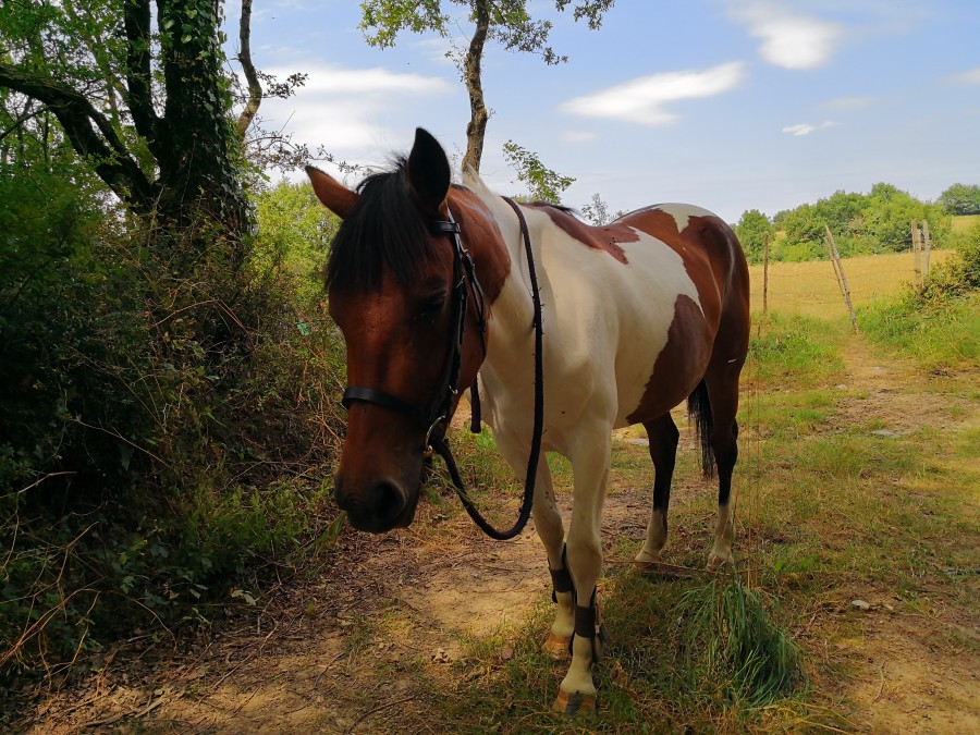 Et aujourd'hui, je l'ai sorti pour un pansage et un petit tour des écuries. La quantité de chevaux le perturbe. Il a toujours été dans des petites écuries, là y'a une cinquantaine de chevaux… Du coup il s'est agité à l'attache quand un cheval passait au loin, et il a paniqué quand il s'est retrouvé à brouter tout seul. Et malgré tout ça, il est ultra respectueux. Je suis ravie de le voir comme ça. Pour moi c'est signe d'un travail sur le respect bien mené depuis que je l'ai, mais aussi une confiance qui se renforce.