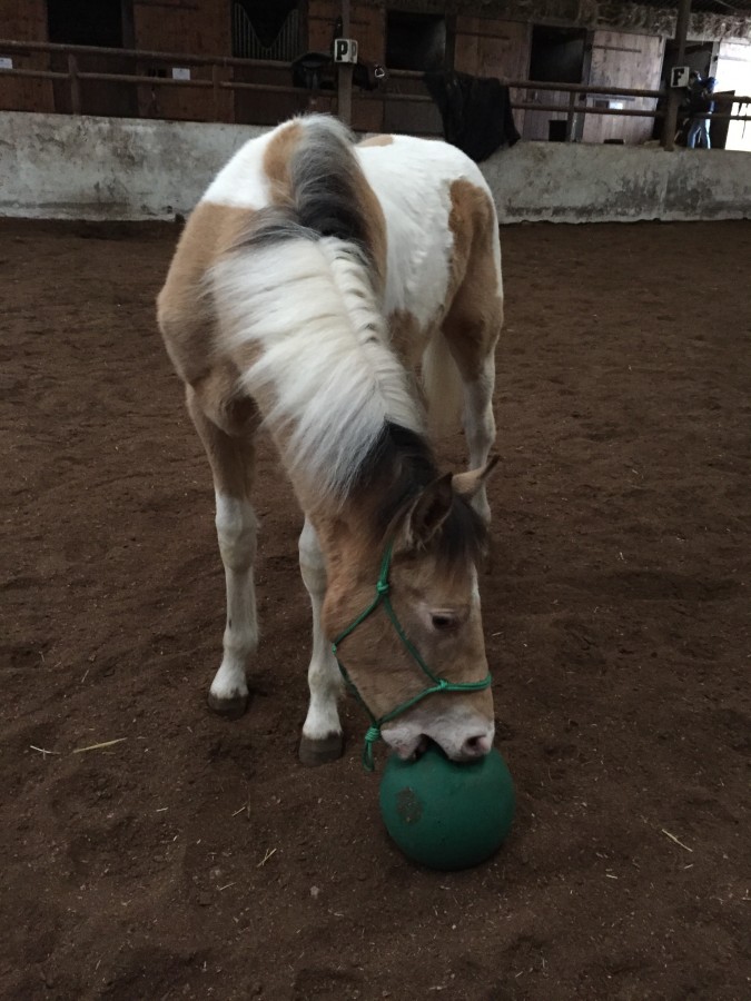 J'ai pu le sortir un petit peu dans un pre vide, mais finalement sans copain il préfère les sorties dans le manège (avec ou sans les poneys).