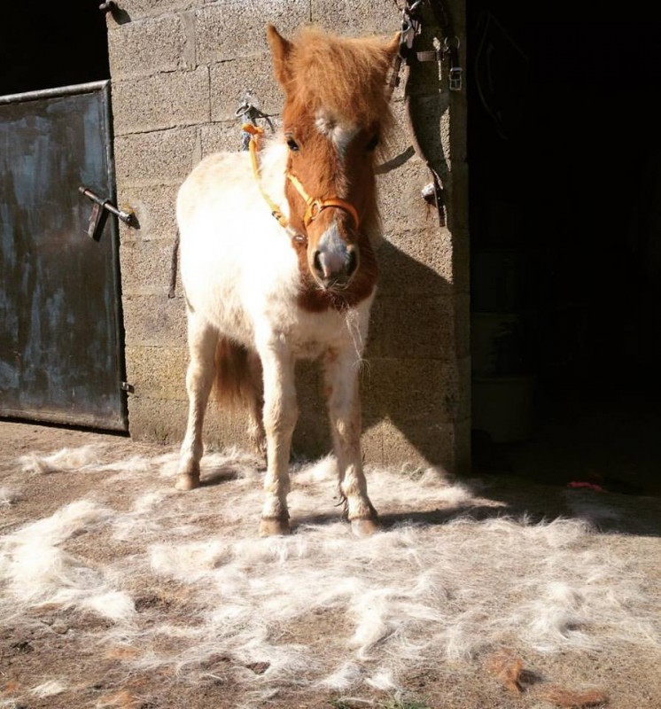 Ma petite fallone à eut 1 an le 27 mars. Elle mesure 1m39 et est en pleine mue elle aussi. Vivant au pres, elle avait prit l'habitude de dormir dans le fumier sous l'abris, et avec ses très longs poils, elle a chopé des boules de crottins et de boue de partout sous le ventre, les cuisses, épaules et j'en passe.