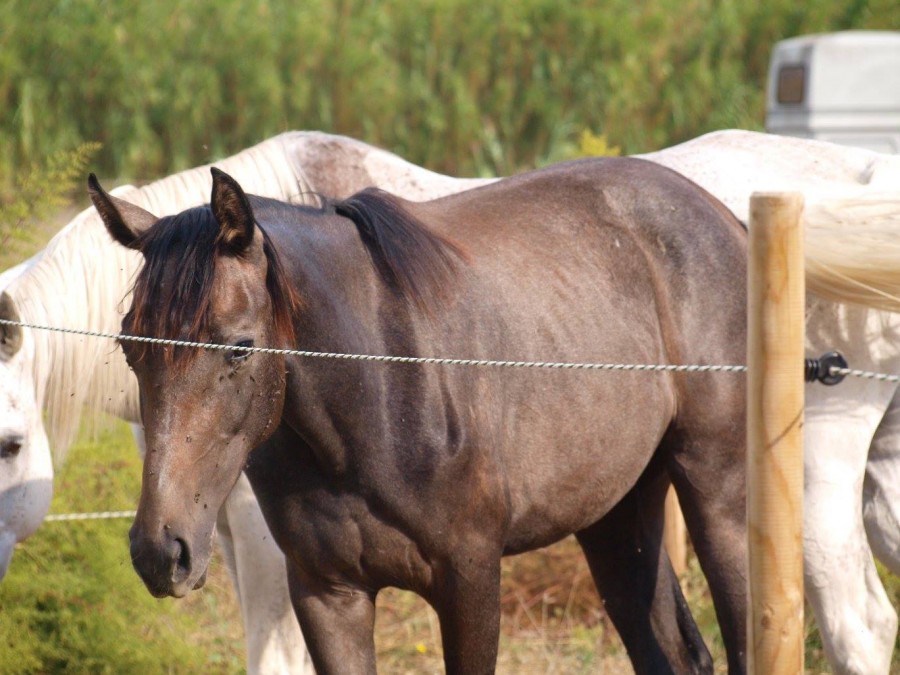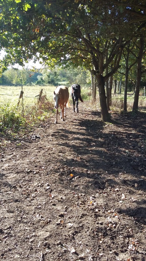 Feeling a fugué dans le pré d'à côté..qui était plus vert! Par le seul côté sans courant! Du coup, j'ai dû à nouveau refaire les clôtures!!