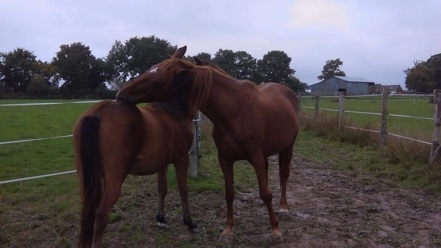 Je l'appelle de plus loin, elle tourne la tête, en règle générale elle vient directement, mais là non .. J'insiste et elle enclenche le pas dans ma direction. Directement la petite Gaïa l'imite, sauf qu'elle vient me rejoindre au petit trot, doublant sa sœur. Fashion s'arrête, me fixe, fait demi tour et retourne se mettre dans son coin de pré.