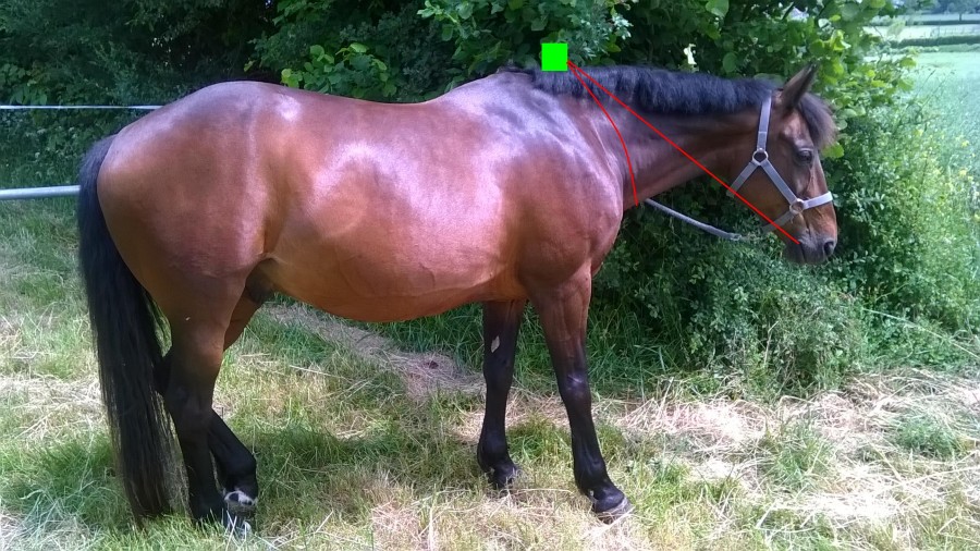 ) en rouge les rênes, en vert la main du cavalier.