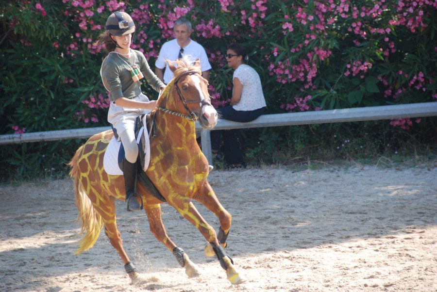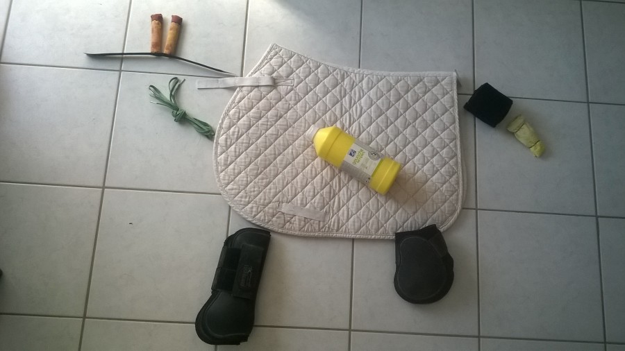 Et pour Bandichou: cornes de girafe, lacets imitation liane pour mettre sur les rênes, tapis blanc, gouache jaune, guêtres et P-B noires et protège queue (je préférerais mettre le jaune mais il est trop petit ou qu'il tient pas je mettrais une bande de polo noire!)!