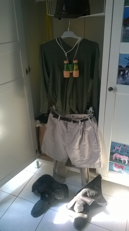De haut en bas: Bombe habituelle, tee-shirt kaki trop grand, jumelles accrochés au t-shirt pour éviter tout à coup (et oui ça pense à tout la dedans!), short trop grand, pantalon d'équit beige et bottes habituelles!!