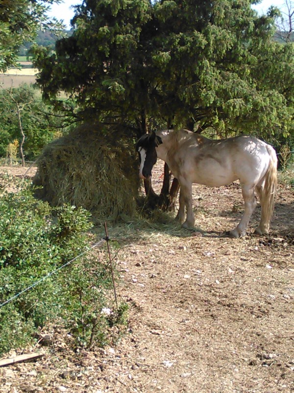 Déjà Fanfan est passé au foin à volonté ! Afin d'optimiser son travail il est seul en paddock, il a des bourricots comme voisin mais bon... Donc j'ai préféré le mettre au foin à volonté afin qu'il s'occupe. Par contre je pensais que c'était un gourmand et pourtant il passe plus de temps à prendre un bain de soleil au lieu de manger