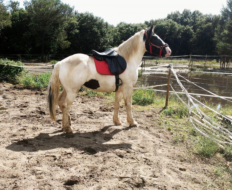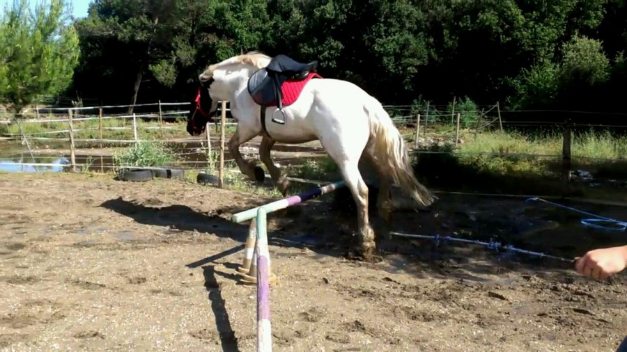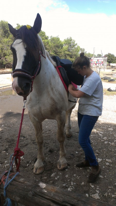 A la base je devais lui mettre la selle et le sangler, mais le fait de poser la selle sur le dos lui fait peur donc j'ai mis et enlevé plusieurs fois la selle afin de le désensibiliser du geste, il n'a suffit que de 3 fois.