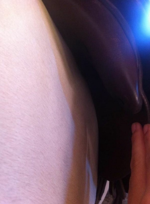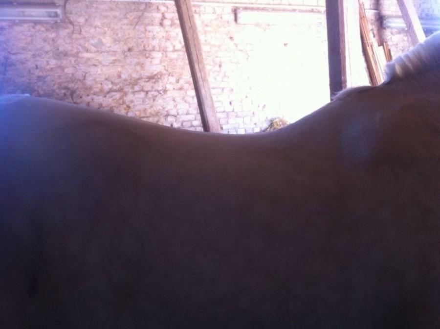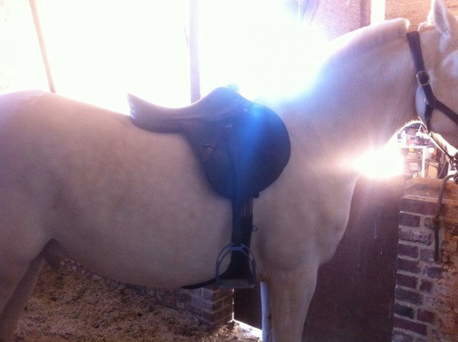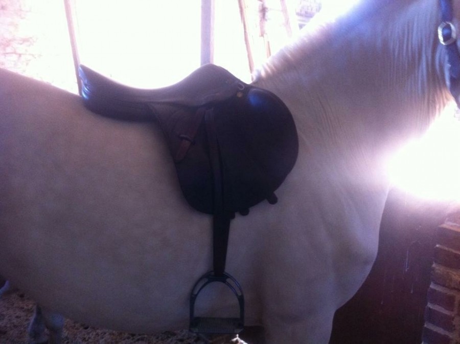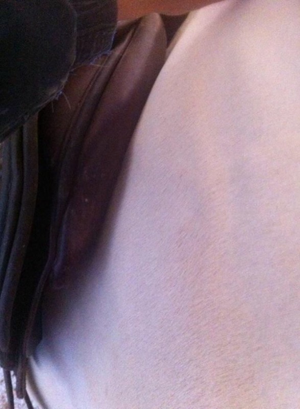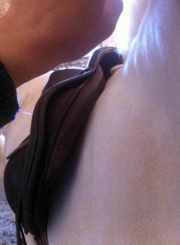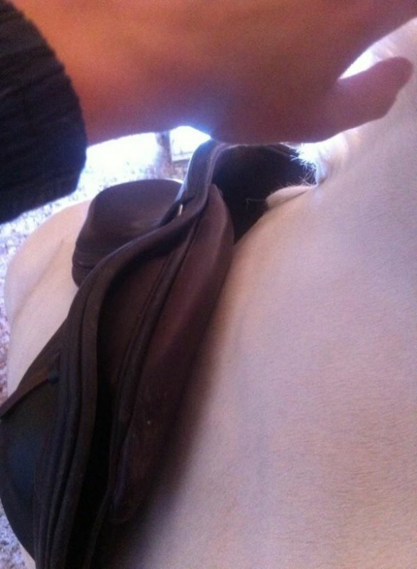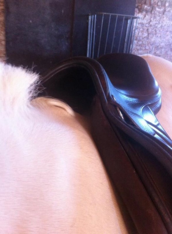 Là on voit clairement qu'il y a un côté où la selle pince le garrot et est complètement décollée de mon cheval ... De l'autre côté c'est moins visible