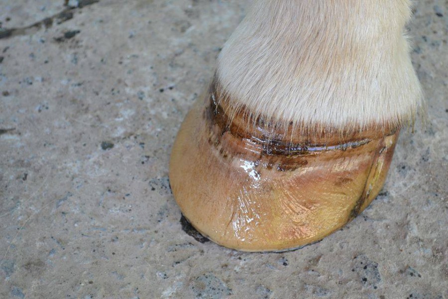Au vu des photos, les lignes de stress sont au quart haut des sabots. Donc, la corne qui pousse après (au-dessus quoi), c'est la corne où tout est, à peu près rentré dans l'ordre (nouvelle pension, retapage de dadou, bons soins). Par contre, la corne en stress et en-dessous, ben, c'est la vieille corne + celle qui a subit les carences et manques. Donc plus fragile et cassante. Il va falloir patienter que tout le sabot se renouvèle (1 an, en general).