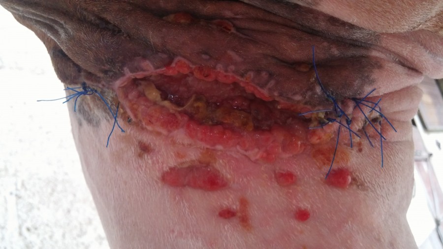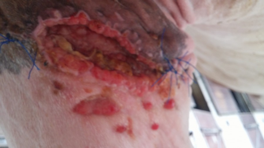 Résultats : plusieurs plaies de gravités différentes aux niveaux de l’antérieur droit et des 2 postérieurs. 2 jours après un énorme hématome se forme (comme un pamplemousse) au niveau du pectoral droit. Puis tout rentre dans l’ordre et les années passent.
