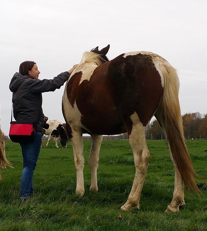 Heu... Tu me veux quoi, toi? »), je commence les grattouilles à l'encolure et aux oreilles. C'est bon mais pas top semble-t-il. J'attaque les fesses et le haut des cuisses.