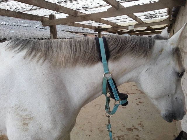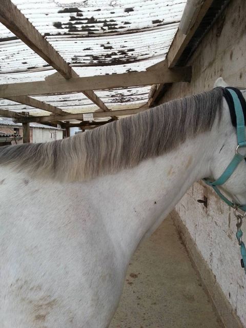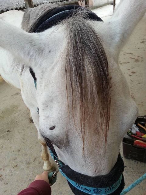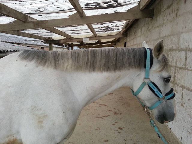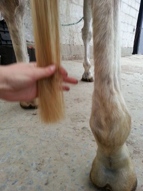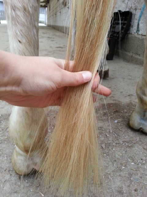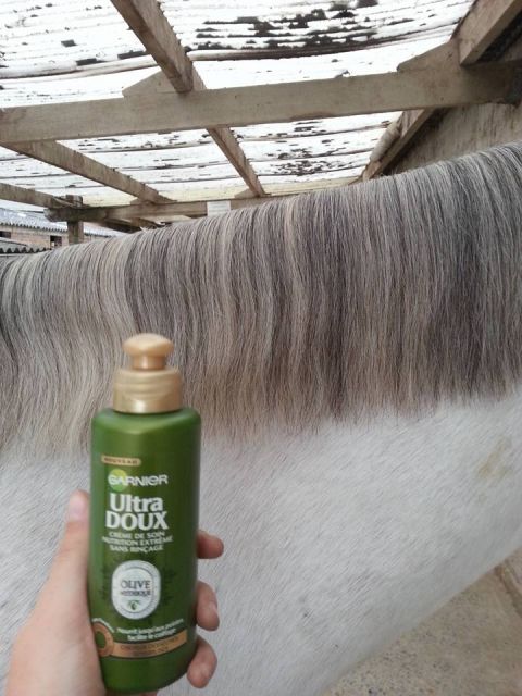 ensuite j'ai frictionné les crins en insistant bien sur les pointes avec ce soin pour cheveux abîmés et très secs à base d'huile d'olive (ça le rend le crin assez gras, donc ne pas utiliser tout les jours, je pense 2/3x par semaine jusqu'à retrouver un joli crin, puis 1x par semaine ensuite)