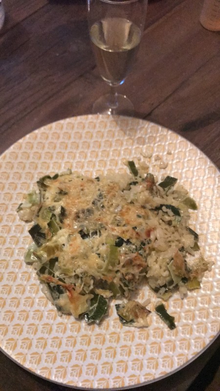 Je valide le gratin riz-poireaux! J’ai mis du parmesan à l’intérieur, et comté et emmental râpé sur le dessus