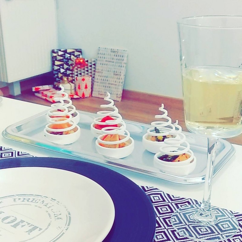 Amuse bouche Picard avec mini verrines en format sympa et différents "toast" : polenta/tomate/chèvre , saumon façon mini croque monsieur, pain d'épices/foie gras/confit d'oignons, mini chou fourré avec saint Jacques et crème.