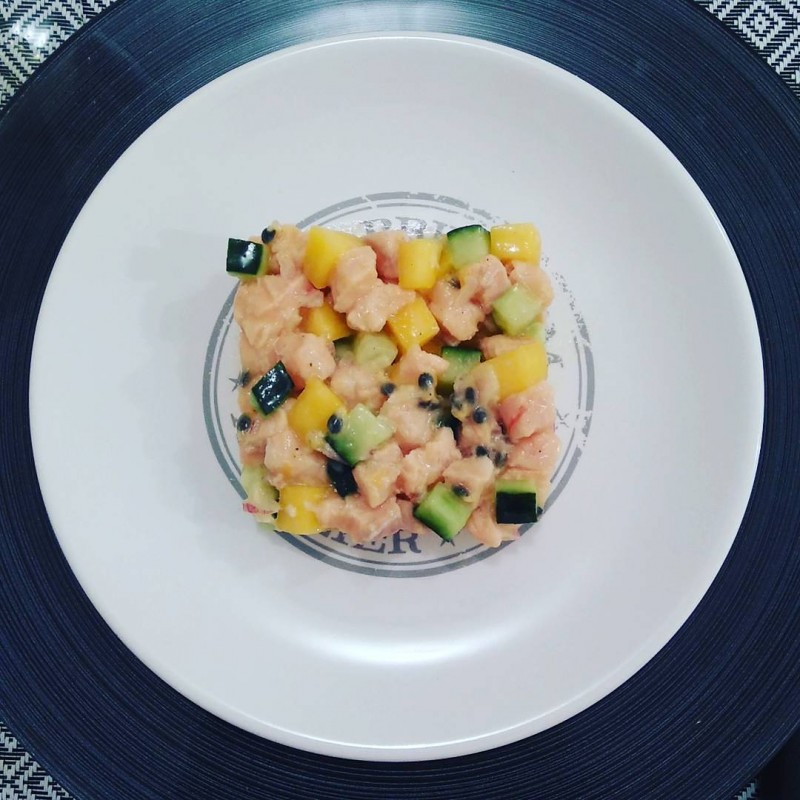 En entrée un tartare de saumon, mangue et concombre assaisonné avec de l'échalote, du fruit de la passion, du lime et une pointe de wasabi pour le peps.