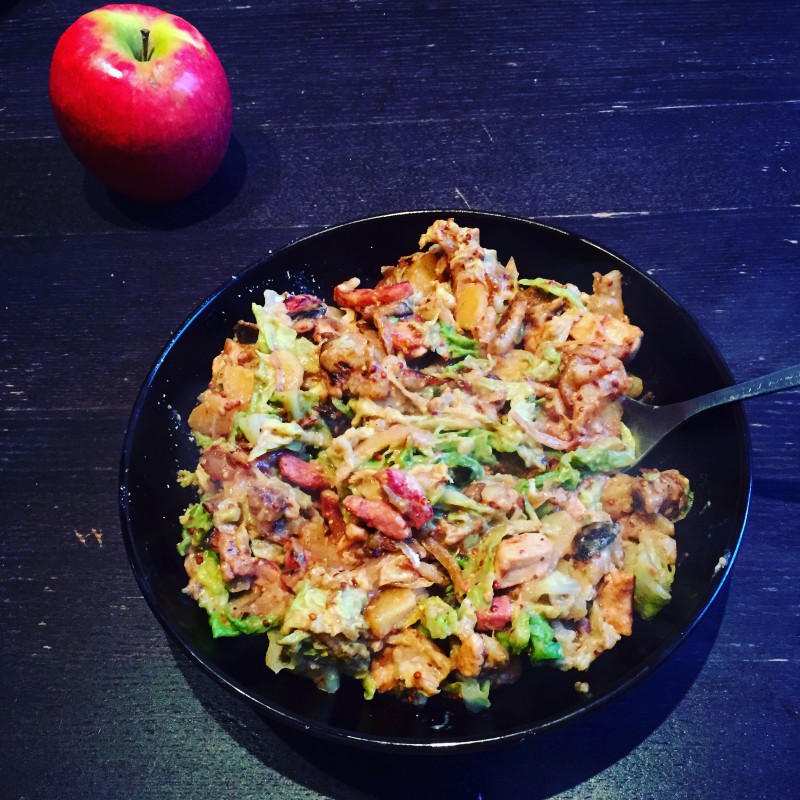 Poêlée de chou vert, pommes de terre (ça change des pâtes), champignon, oignons, lardons, blanc de poulet et moutarde à l'ancienne