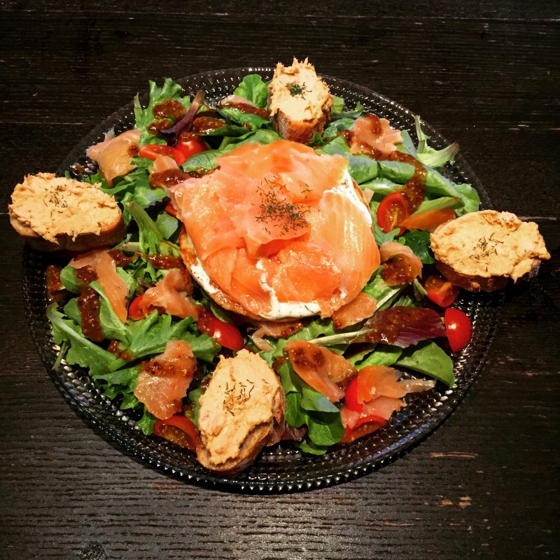 Salade Avec du saumon pour midi, rillettes de saumon et blinis