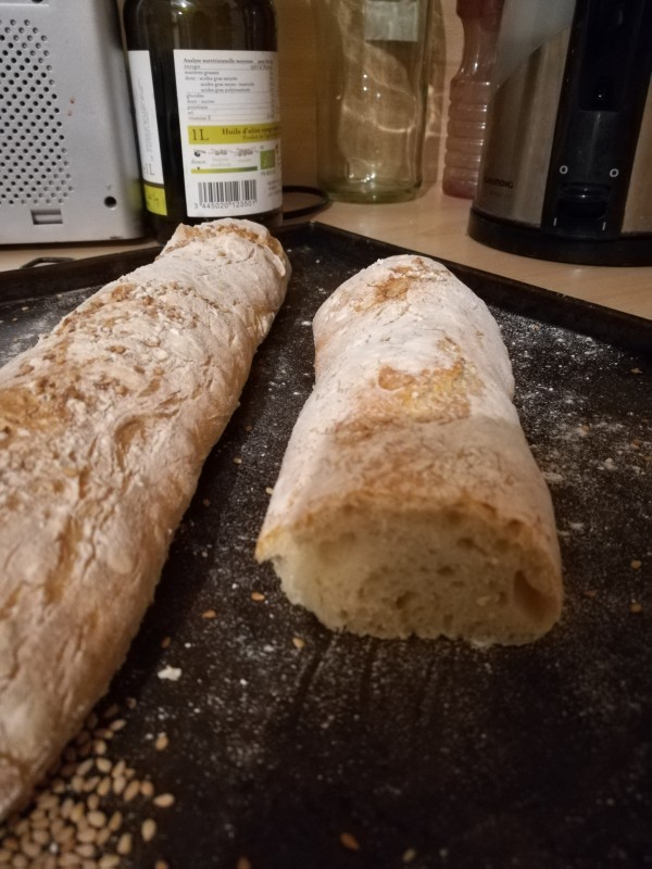 Sachant que la pâte a très bien levé, elle a triplé de volume. Je ne l'ai pas retravaillé après, juste divisé en deux et formé des boudins. Par contre j'ai attendu que le four atteigne les 240 avant d'enfourner (ayant fait lever la pâte dans le four, je ne pouvait pas le mettre à 240 à l'avance). Vous pensez que le temps d'attente hors du four a pu être la cause? La prochaine fois j'enfournerais direct et la température montrera pendant que le pain est dedans, on verra bien...