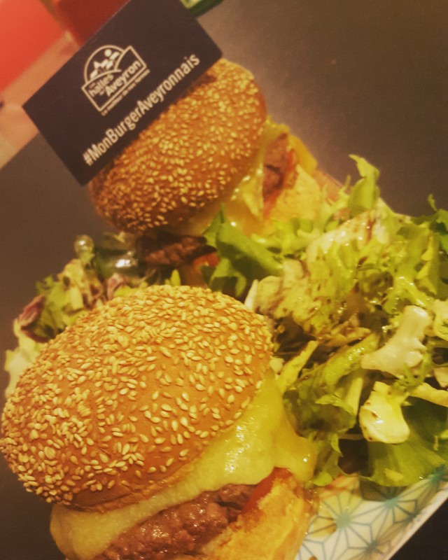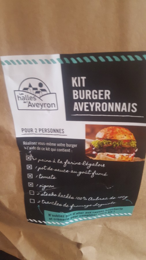 Tout à l'heure j'ai acheté un "kit burger" dans le magasin où je fais mes courses (les halles de l'Aveyron), steak haché devant moi, laguiol, super pain au sésame, une sauce goût fumé, oignon, tomate. C'était super bon!