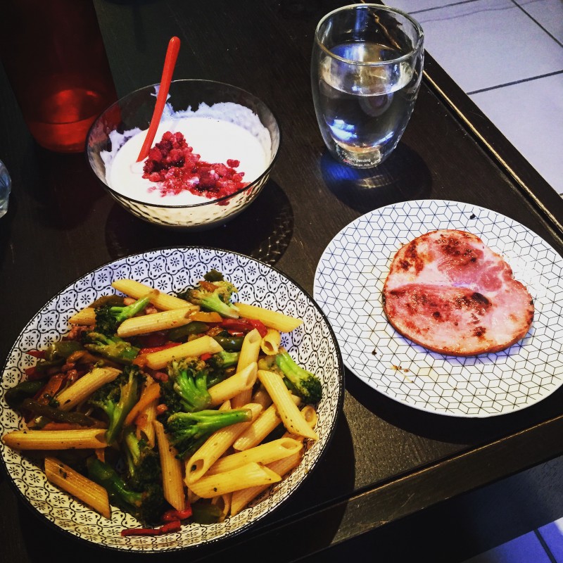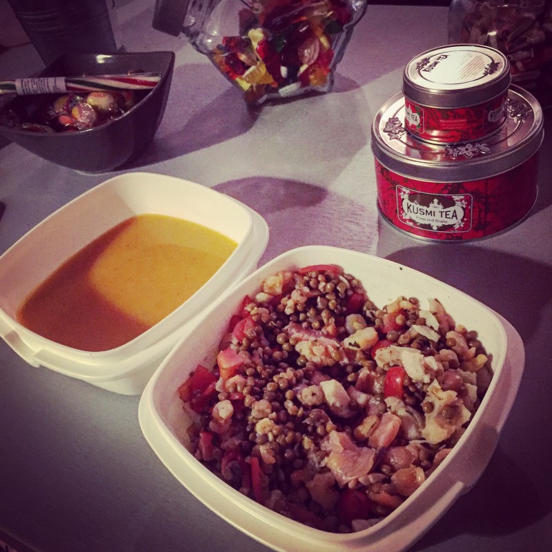 Ce soir c'était petit pain au fromage avec 3 tonnes de fromage en plus (chèvre, bleu et gorgonzola), salade et taboulet. Repas rapide mais de gros sac (j'ai pas déconner sur la quantité de fromage) puis un yaourt soja-mangue en dessert et à l'instant 4 carrés de chocolat noir pâtissier (calorique donc). Pour un repas du soir c'est un peu trop lourd en calories, sucres et gras...
