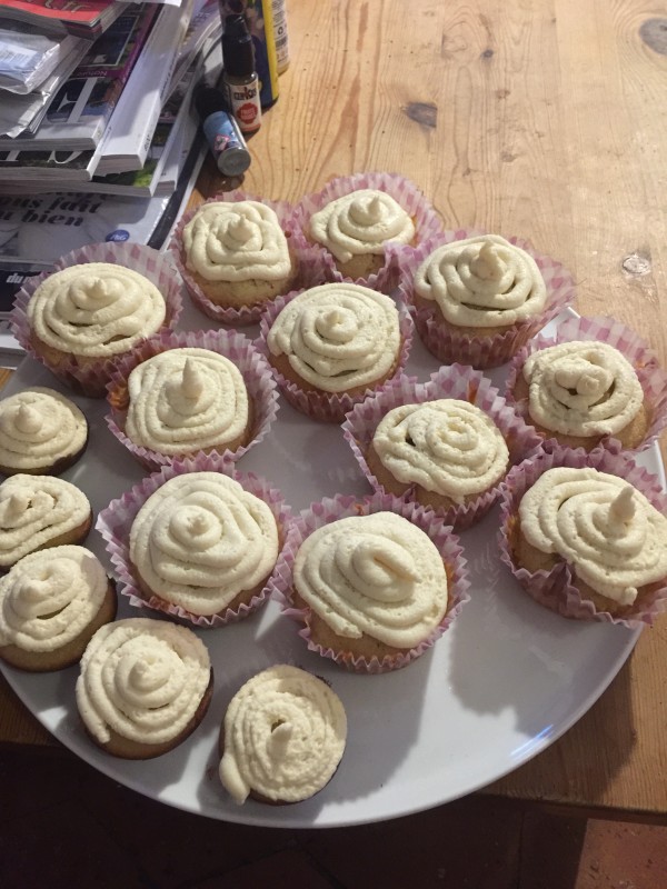 J'ai fait des cupcakes glaçage chocolat blanc. Bon j'avais pas la bonne poche à douille ce qui explique le glaçage tout caca