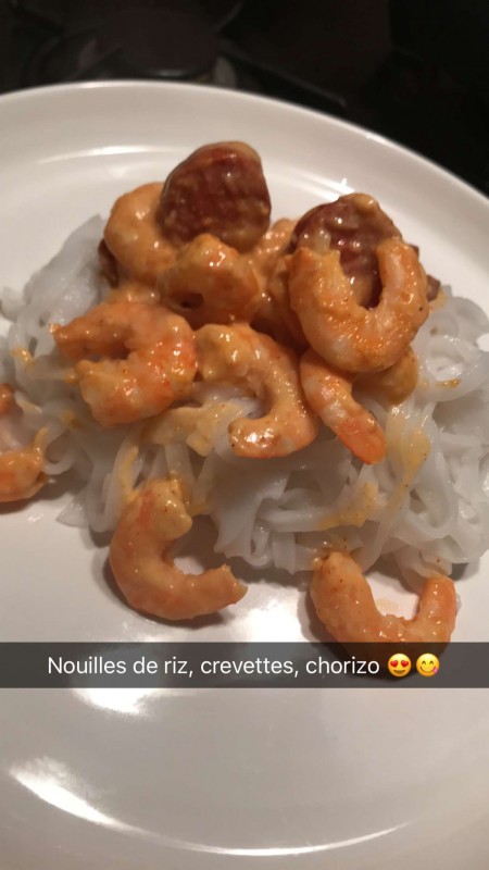 Et ce soir j’ai fait des nouilles de riz avec des crevettes et du chorizo, une première aussi, super bon