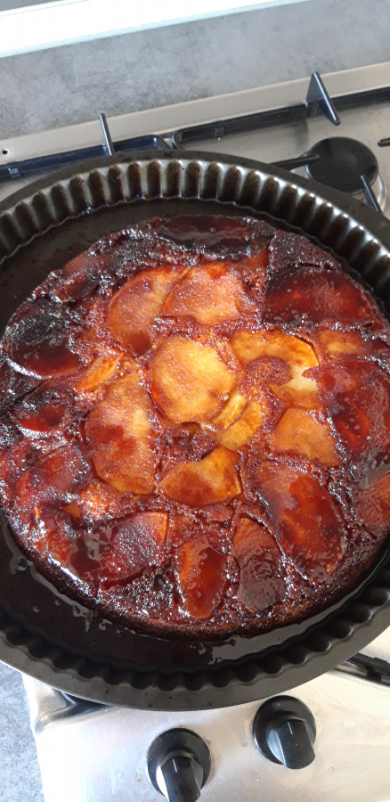 Et pour ce soir, un gâteau au yaourt et pommes caramélisées est au four.