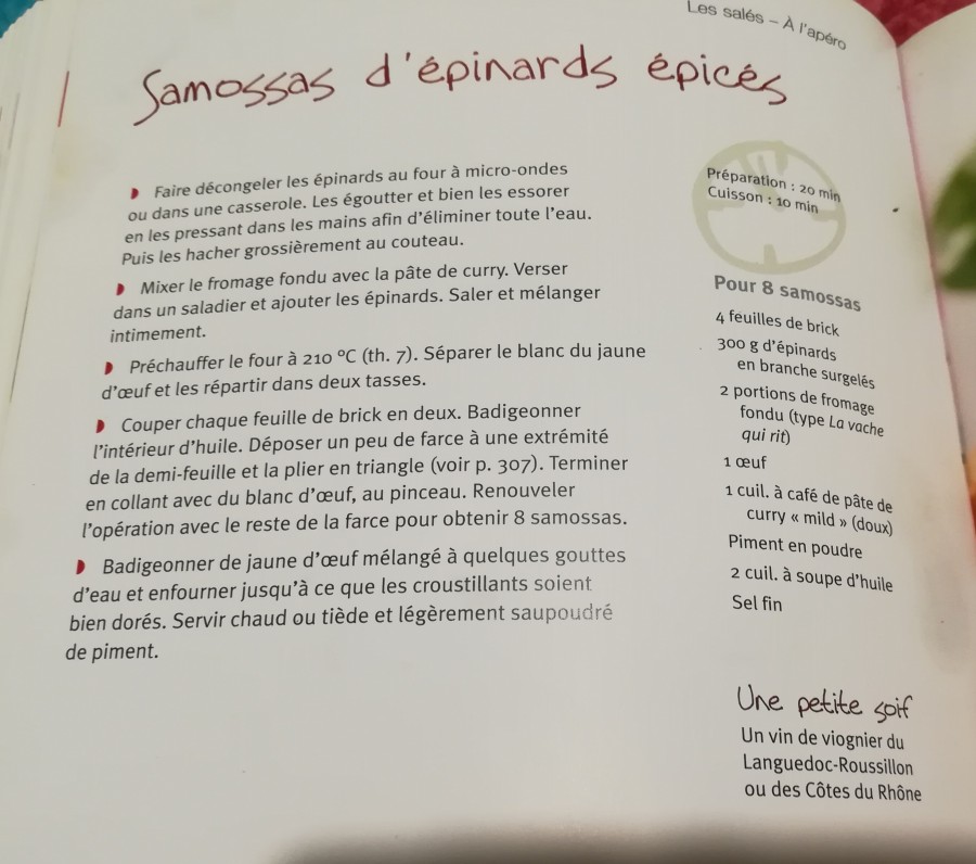Sinon, j'ai testé une recette de samossas épinards vache qui rit pâte de curry qui a plu à tout le monde, si ça vous intéresse je vous la mets