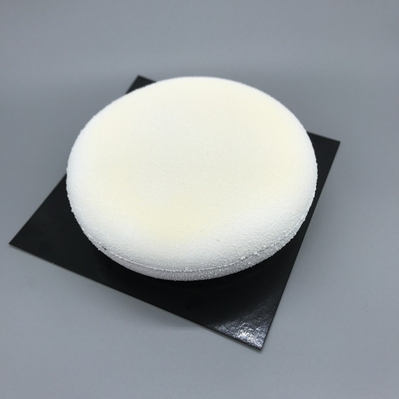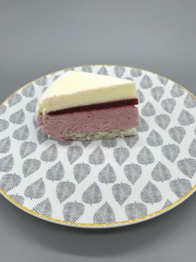 Entremets framboise coco citron vert (dacquoise coco citron vert, mousse framboise, insert framboise, mousse citron vert, spray velours blanc ), dans le moule Éclipse de Silikomart. Et oui, encore du sucré ^^