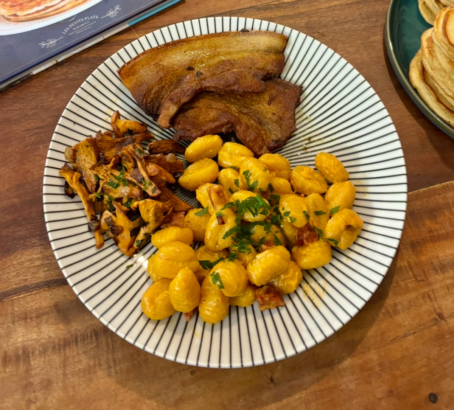 Bon sinon ici ce soir ce sera gnocchis de courge, girolles et lard mariné