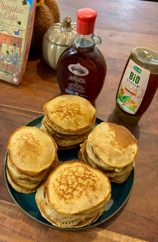 J’ai aussi fait des pancakes, je voulais tester le sirop d’agave pumpkin spice de Lidl mais je sais que je vais les préférer avec le sirop d’érable canadien ramené par ma cousine