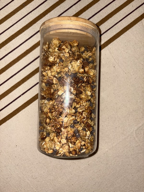 Et voici mon granola, j'en avais déjà fait plusieurs fois, mais là c'était une toute nouvelle recette, un test on va dire. J'ai mis environ 250g de flocons d'avoine et 50g de farine de pois chiche, je n'avais plus de graines, tant pis. Pour lier le tout : un mélange de banane écrasé + miel et un peu d'huile d'olive. J'ai ajouté un mélange de pépites de chocolat et de morceaux d'une tablette de chocolat au lait. Et bien sur la compote c'était délicieux ! Super pour accompagner un petit dessert !