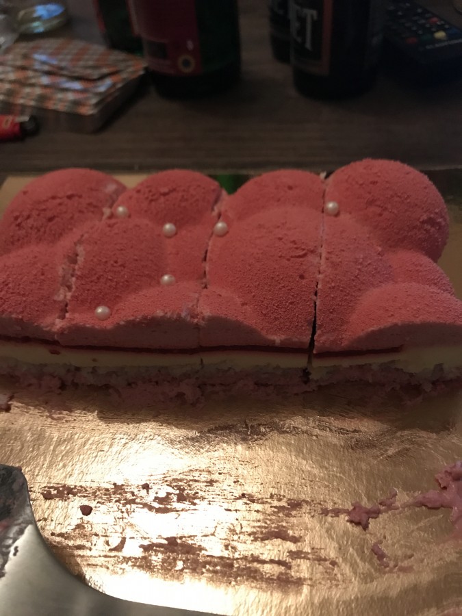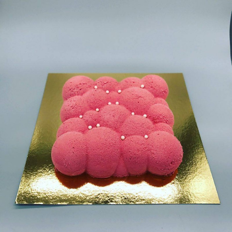 Toujours le même entremets, avec une présentation différente (dacquoise coco citron vert, mousse citron vert, mousse framboise, insert framboise) , spray velours rose et perles de sucre