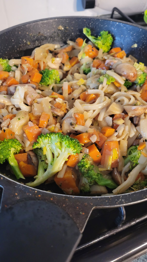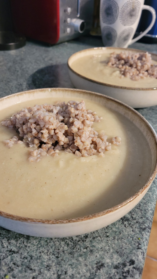 Velouté de chou-fleur avec sarrasin, nouilles de riz aux légumes