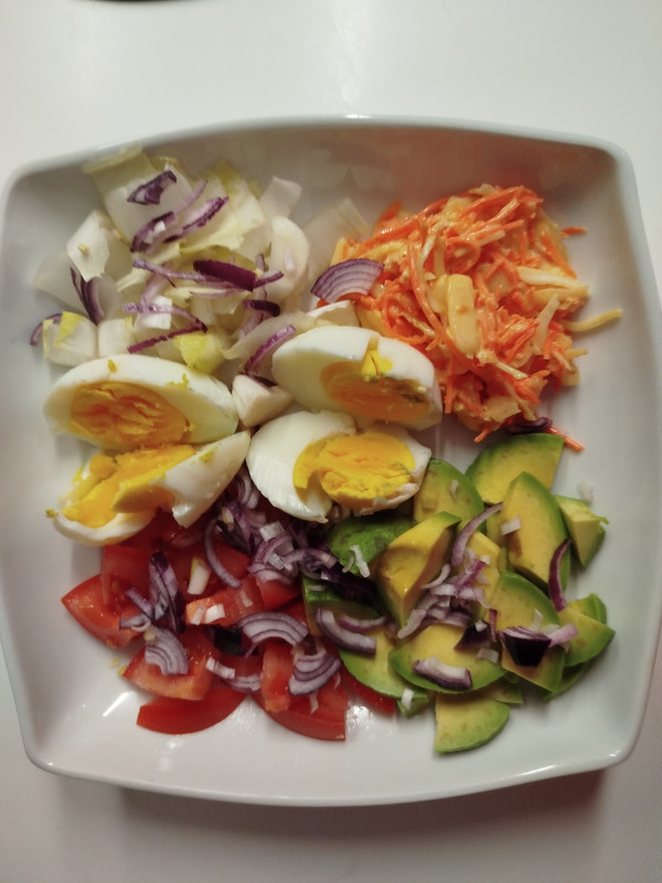 Ce soir, même si le temps est encore frais, assiette de crudités..: endives, reste de colleslaw.tomate, avocat, oignon rouge et oeufs durs.
