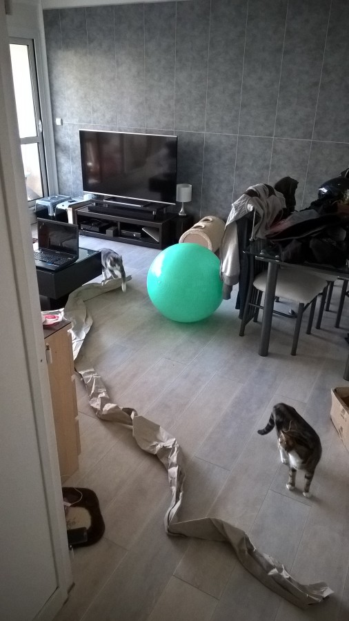 (carton dépiotté, ballon de gym en plein milieu, arbre a chat par terre, les deux pulls sur la tables déplié etc
