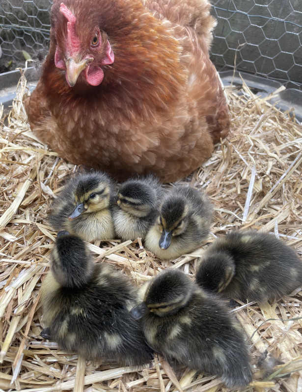 Une poule s'est prêtée au jeu et nous avons réussi à sauver 4 canetons sur les 7 (c'est mieux que rien).