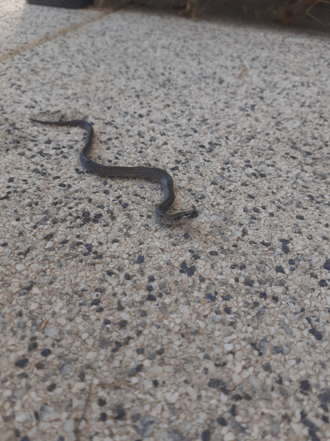 Le serpent sur ma.terrasse harcelé par mon chat et mon chien. Je pense que c'est mon chat qui l'a emmené