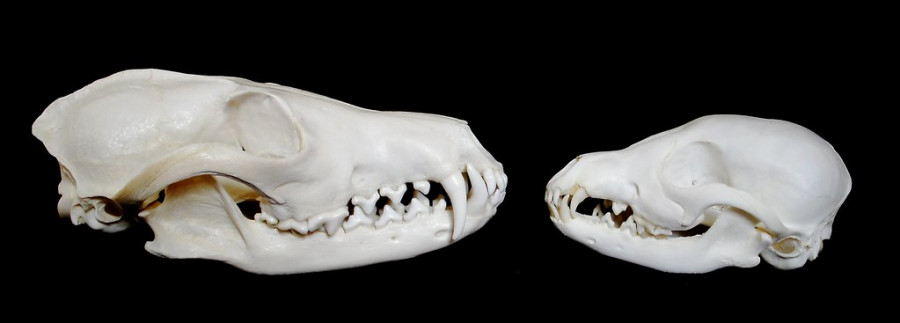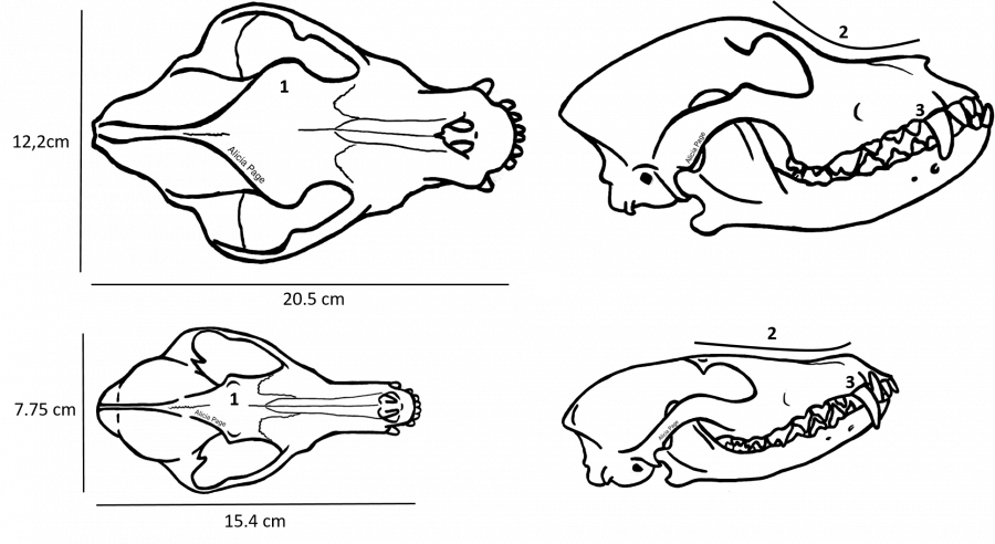 Image de comparaison trouvée sur internet entre un crâne de chien (en haut) et de renard (en bas) :