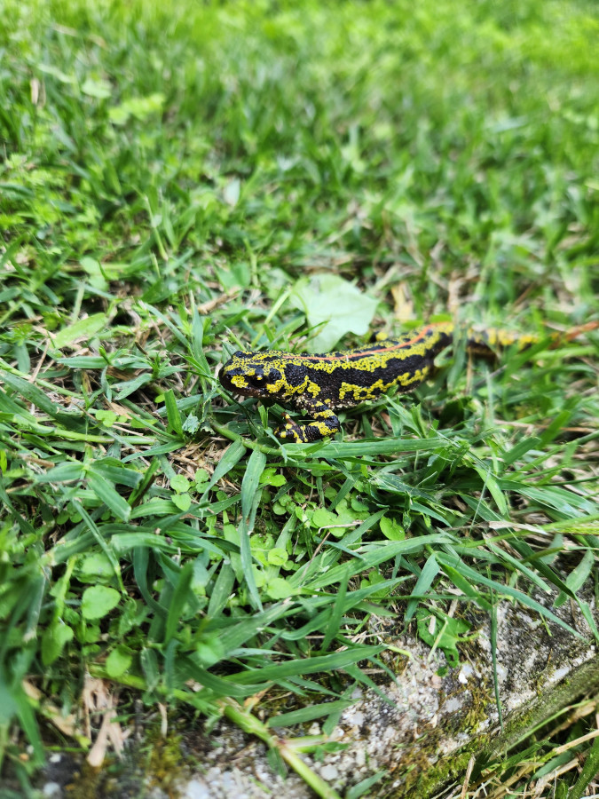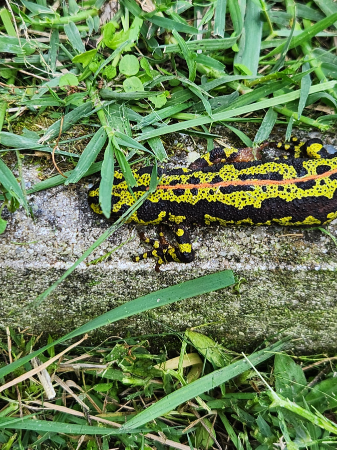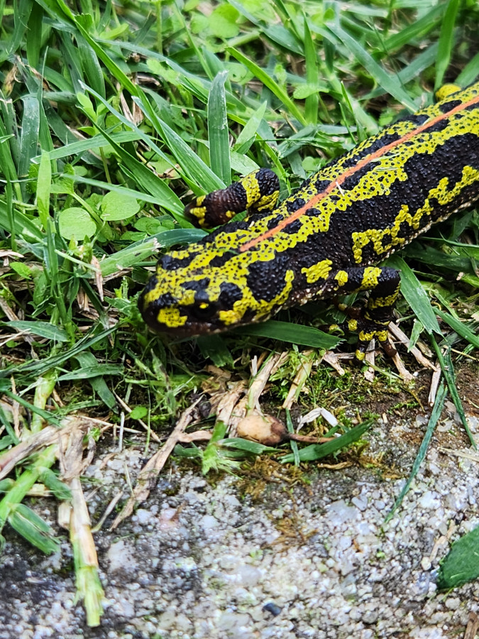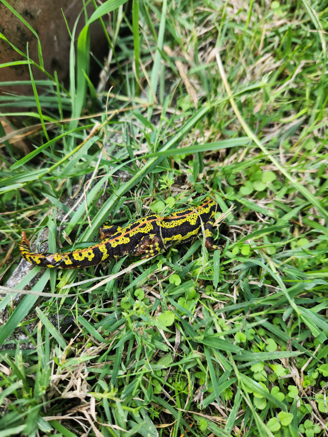 Jolie surprise cet aprem en désherbant le jardin en bordure de terrasse : un triton marbré (femelle en principe) J'ai cru que c'était une salamandre au début J'ai vite viré les chats quand elle a attiré leur attention et elle a pu aller se cacher, ouf.