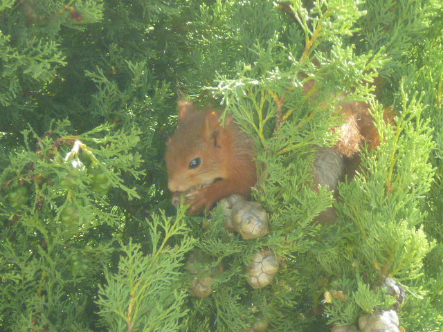 Bon je le vois mieux l'hiver, sans les feuilles. En ce moment je le vois voler entre les 2 arbres, puis ça bouge dans les feuilles