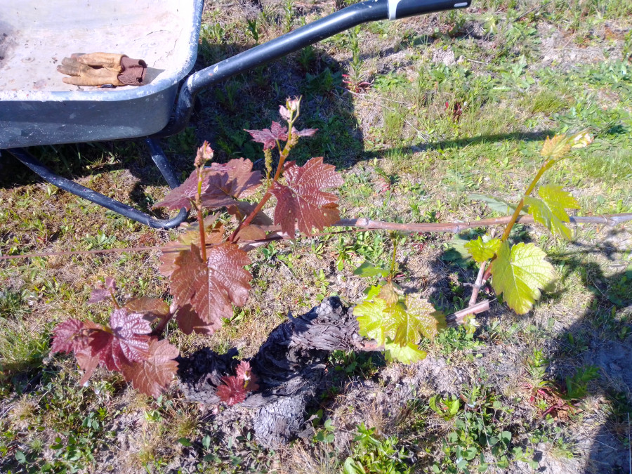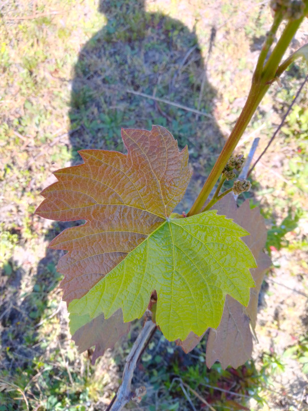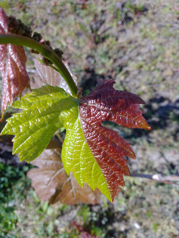 Au milieu de la parcelle, je tombe sur 2 pieds originaux : 1 bras du ceps porte un feuillage bordeau, l'autre porte un feuillage vert :