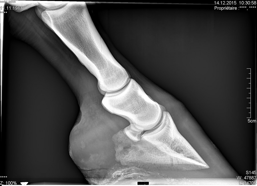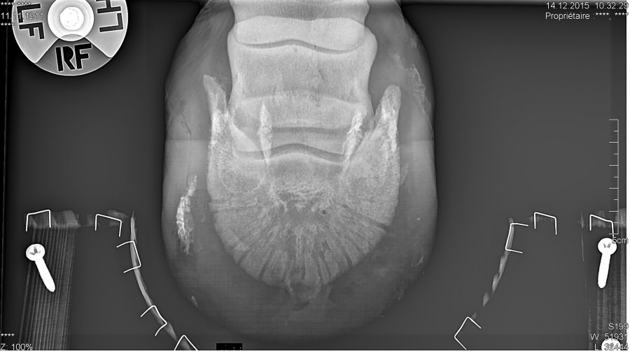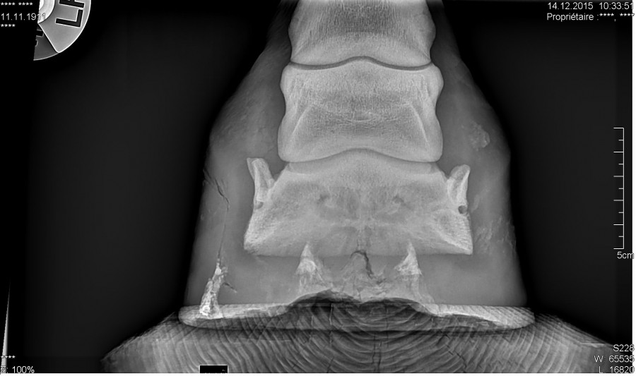 Il creuse tout le long de la ligne blanche. Verdict : depuis début septembre, l'abcès a fait tout le tour du pied. Il en a rarement vu un aussi gros et ayant mis tant de temps à sortir...